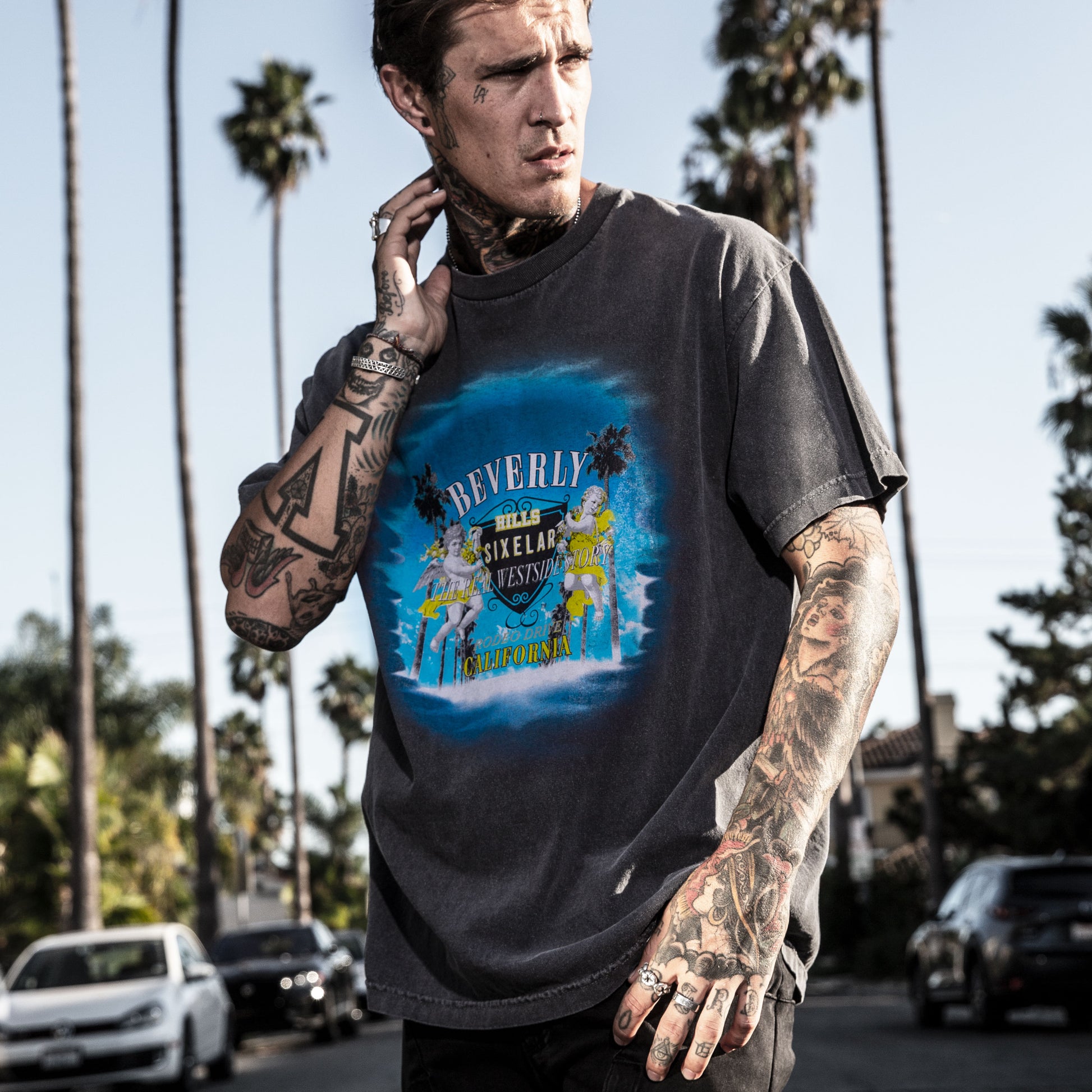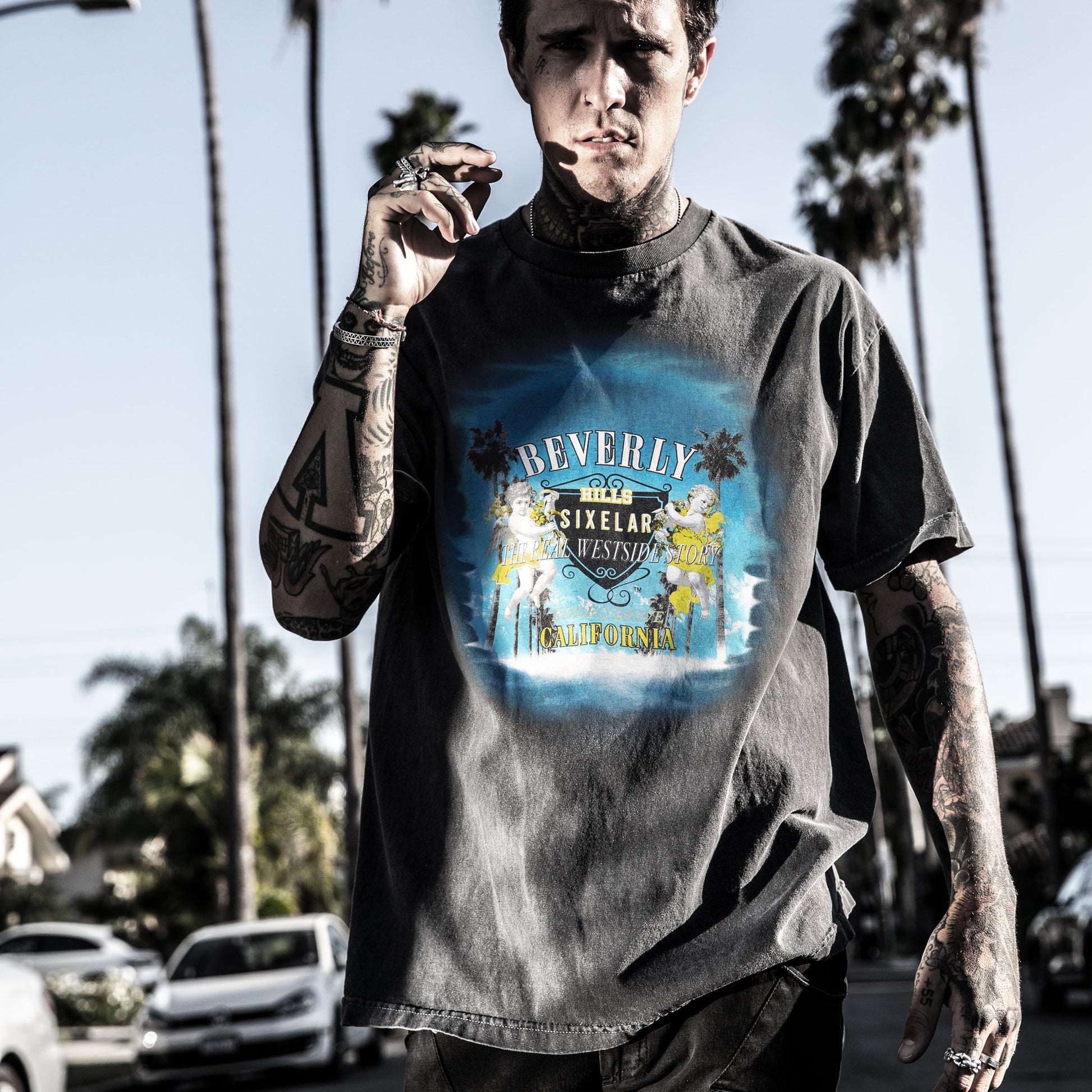 Blue LA sky and palms adorned by angeles