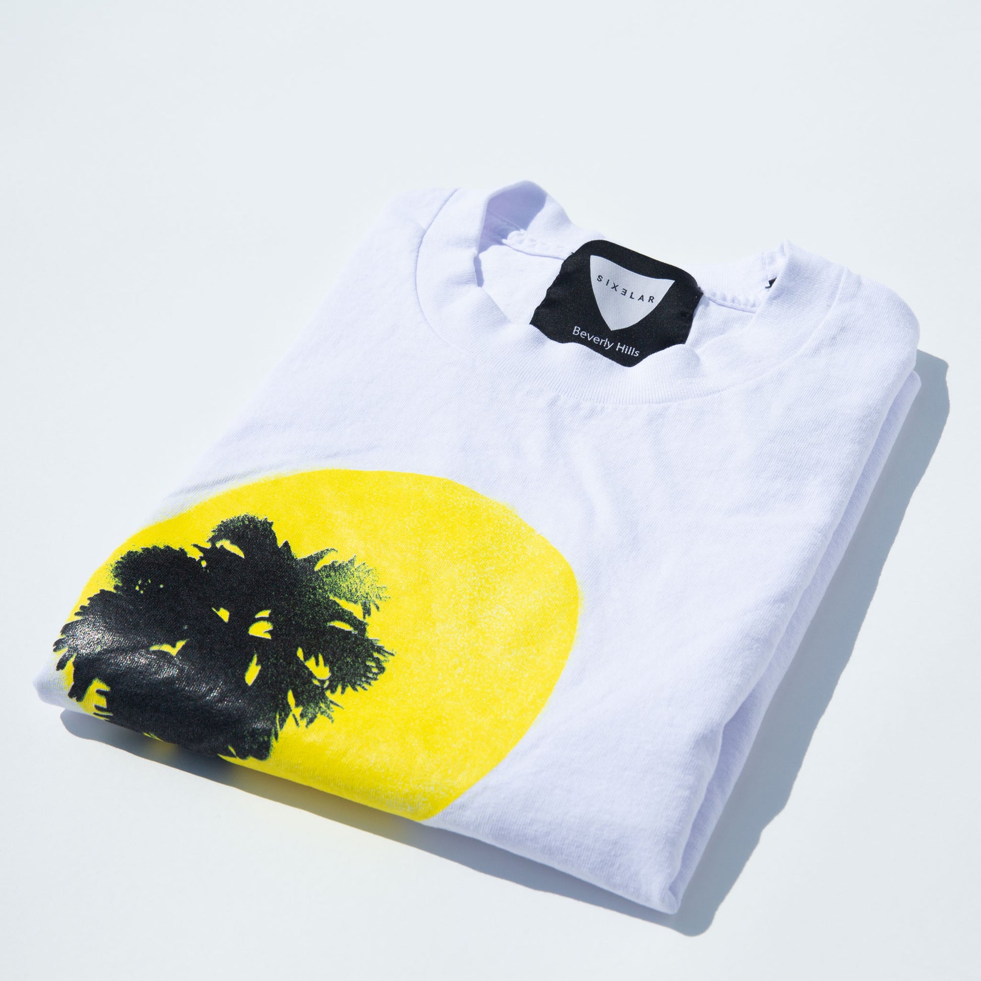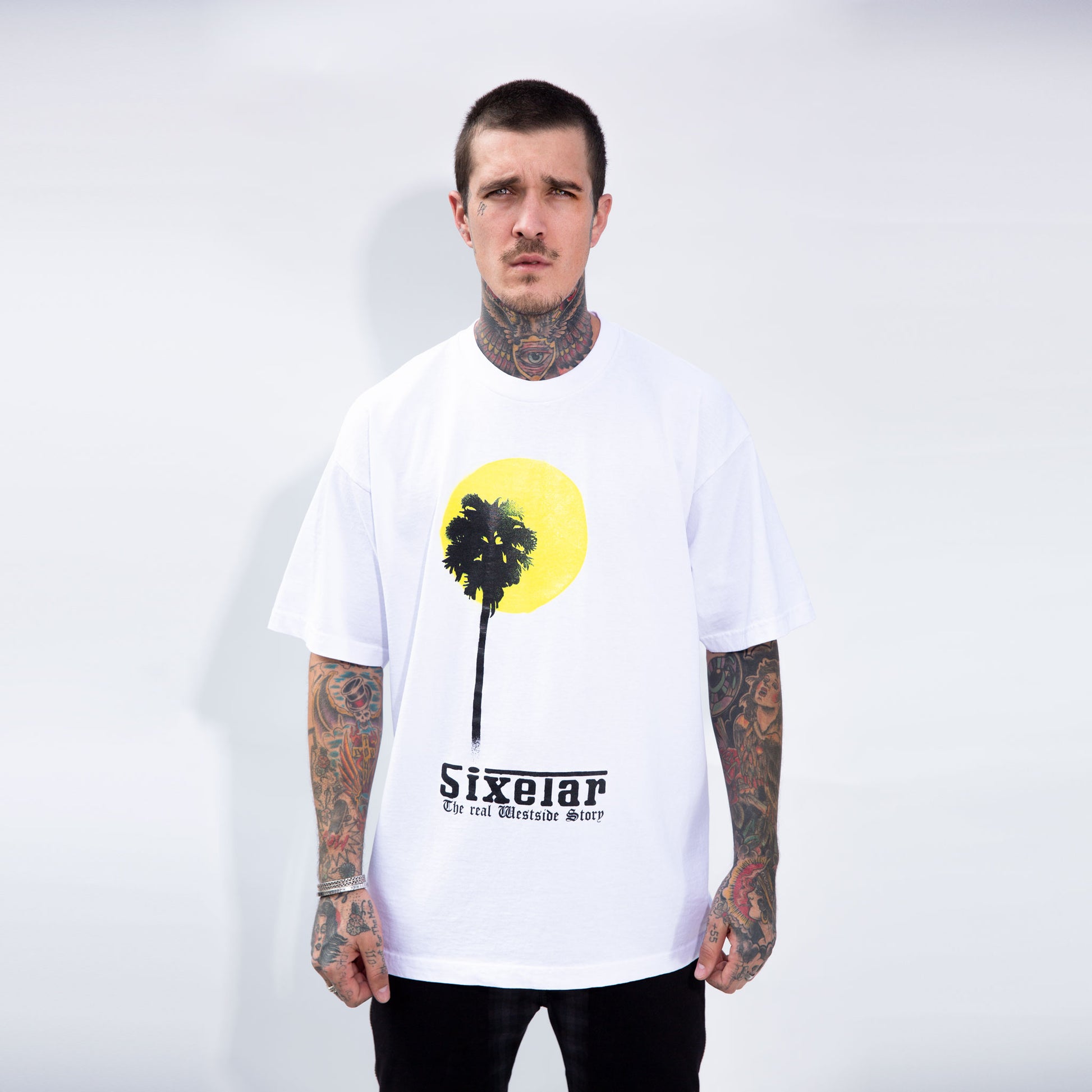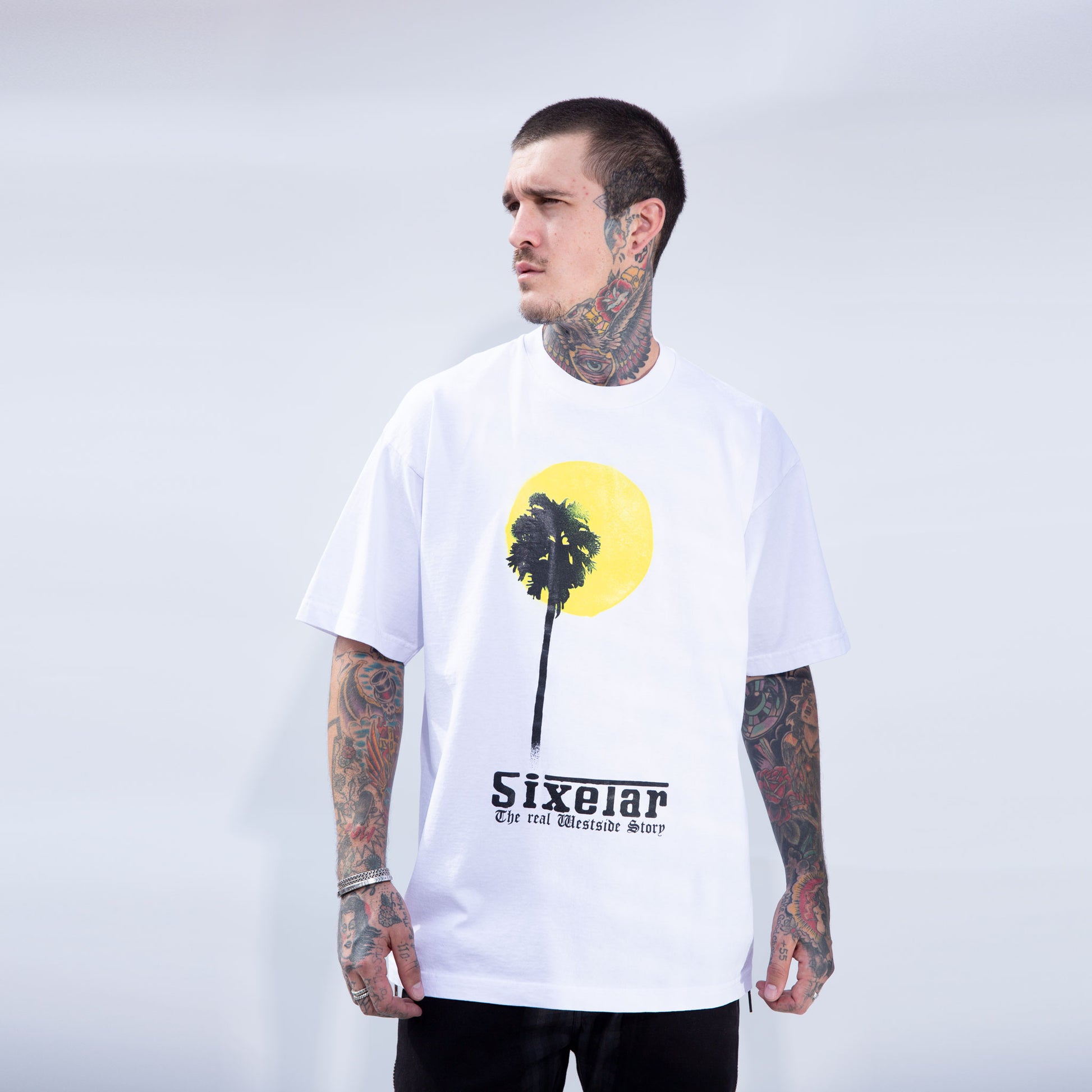 Iconic LA Palms overlapping a bright sun are represented in this Sixelar tee with Ferrari-esk fonts.